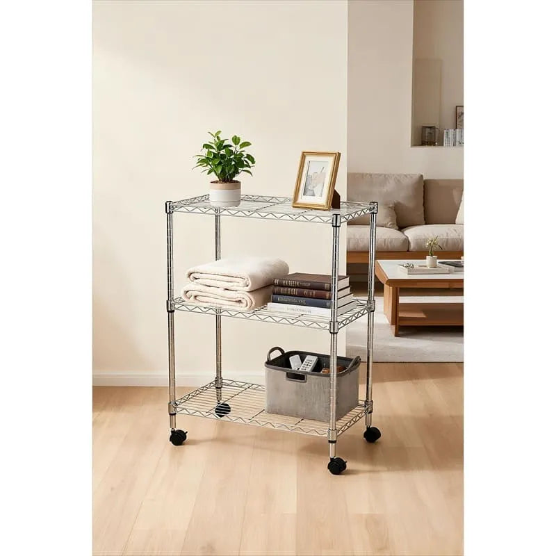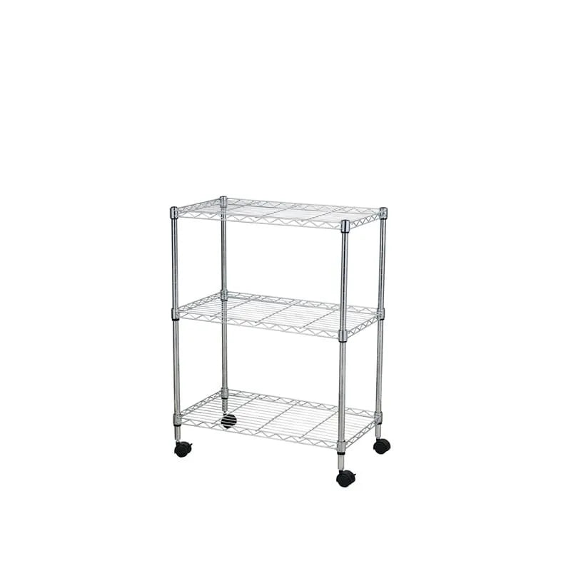 Estantería metálica cromada de 3 niveles modelo CJ-B1436CW, ideal para organizar productos en cocina, baño, oficina o bodega. Su estructura de acero al carbono con acabado brillante ofrece resistencia y durabilidad, mientras que las ruedas de nylon permiten una movilidad segura y silenciosa.