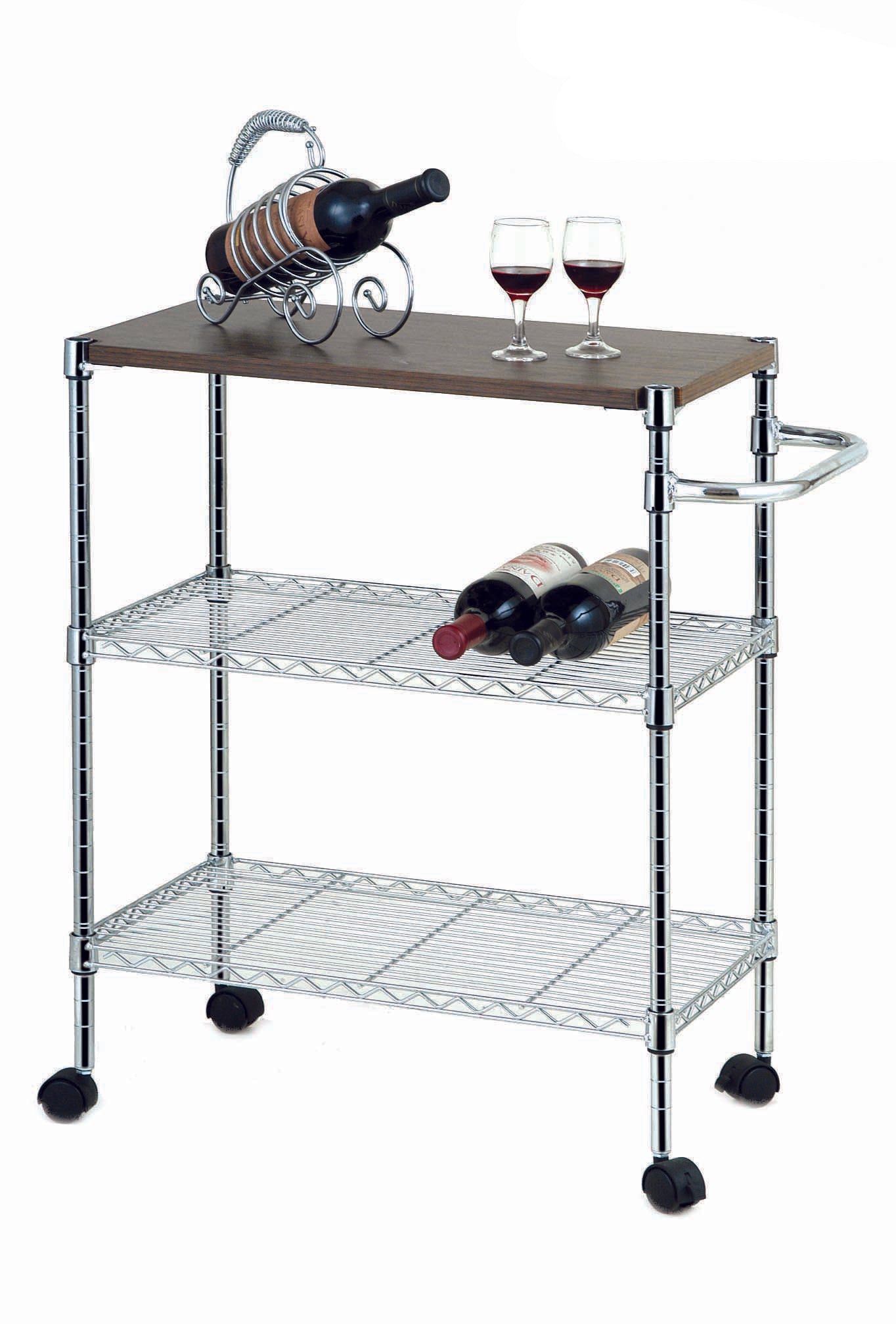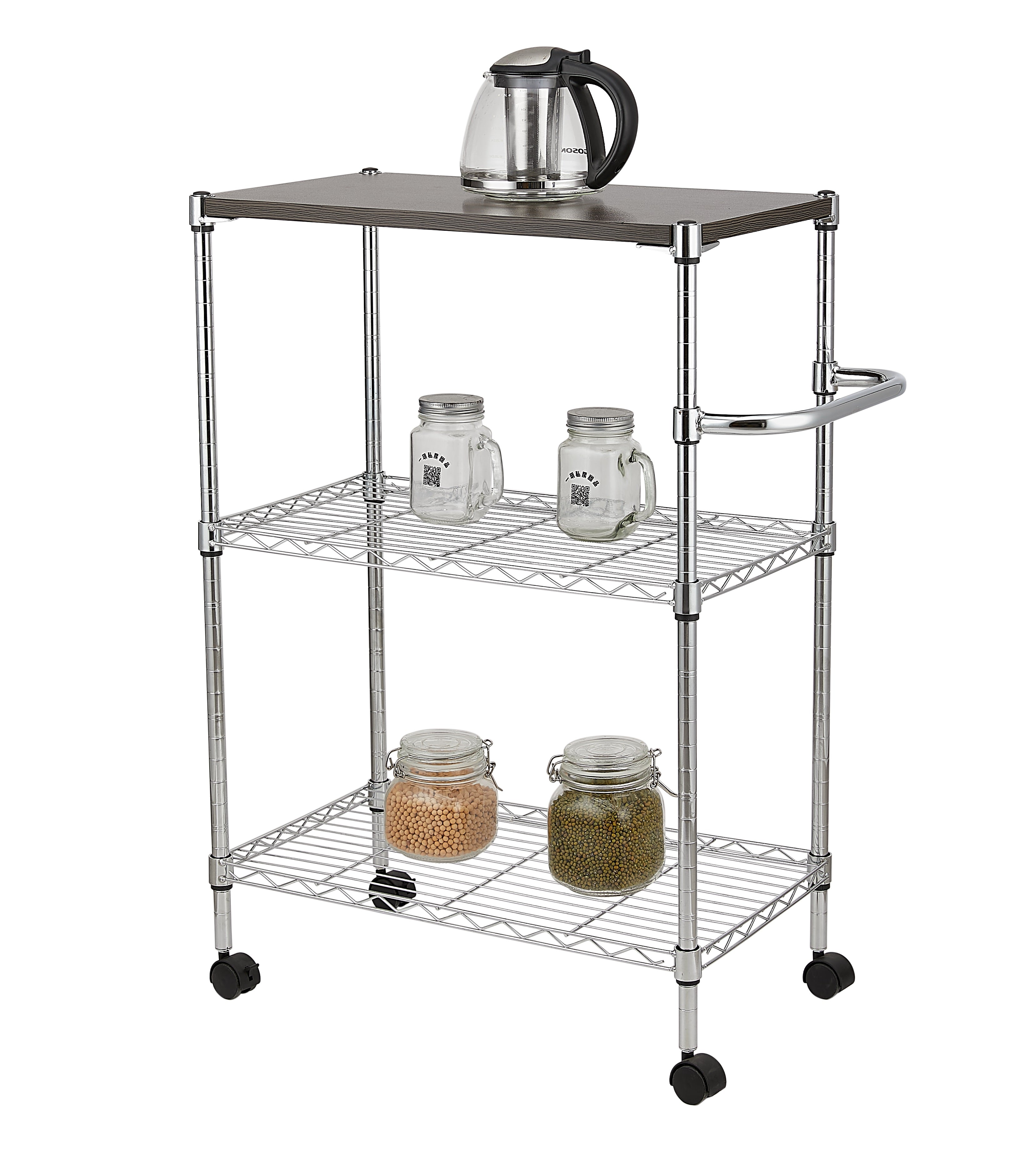 Carro de Cocina Cromado de 3 Niveles con Cubierta de Madera