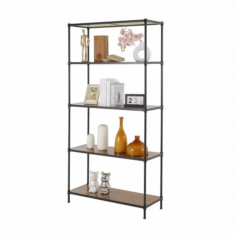 Estantería de 5 niveles modelo CJ-B1862-BK22, con repisas de bambú y estructura metálica negra, ideal para espacios que combinan funcionalidad con estética natural. Su diseño sobrio y resistente permite organizar productos en cocina, baño, oficina o living, aportando calidez visual y durabilidad.