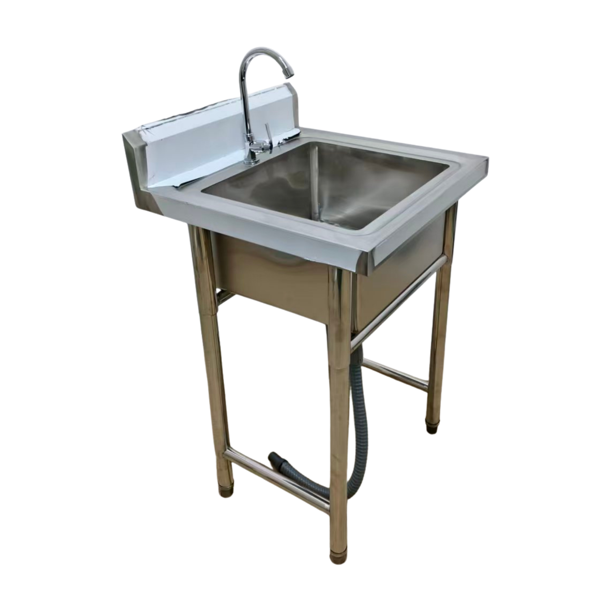 Lavaplatos de acero inoxidable 60x60 cm con cubeta profunda, ideal para cocinas industriales, restaurantes y hogares exigentes. Incluye grifería giratoria y desagüe flexible. Compacto, resistente y fácil de limpiar. Optimiza el lavado en espacios reducidos.