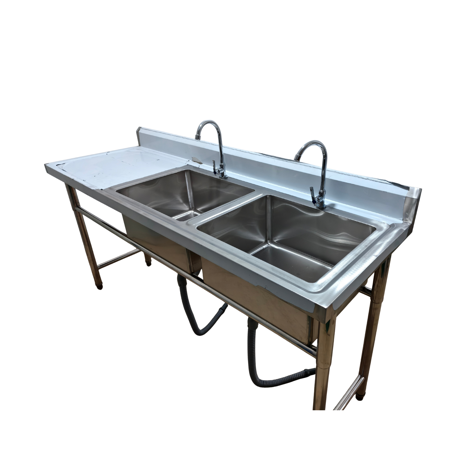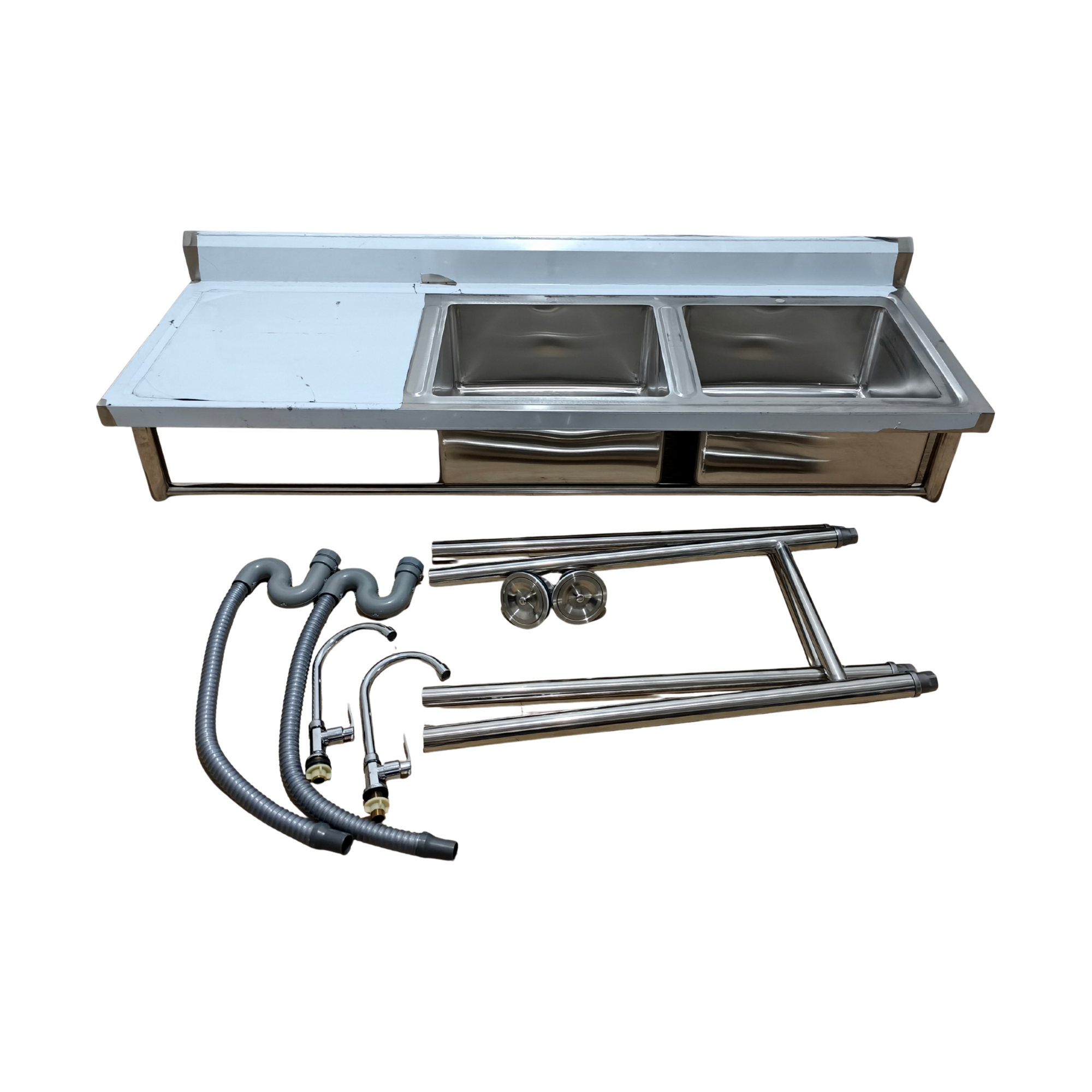 Lavaplatos doble de acero inoxidable 120x60 cm con secador izquierdo, ideal para cocinas industriales, restaurantes y hogares exigentes. Incluye grifería giratoria y desagüe flexible. Resistente, higiénico y funcional. Mejora el flujo de lavado y escurrido.