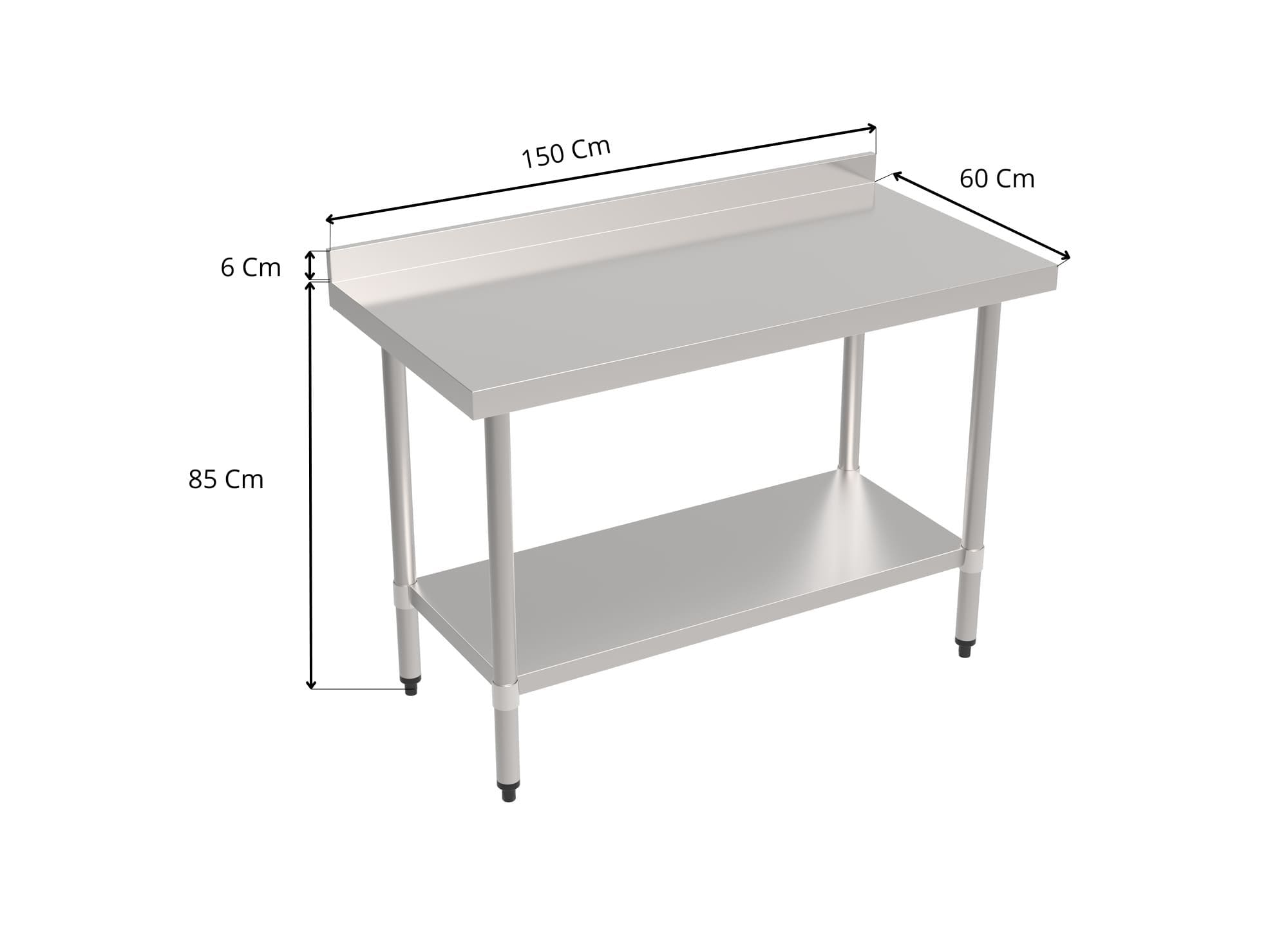 Mesón mural INOXSTEEL 150x60x85(+6) cm, ideal para cocinas profesionales. Cubierta en acero inoxidable AISI-430, estructura galvanizada y viñeta trasera de 6 cm que evita escurrimientos. Resistente, higiénico y fácil de limpiar. Cumple con normativas sanitarias y optimiza el trabajo diario.